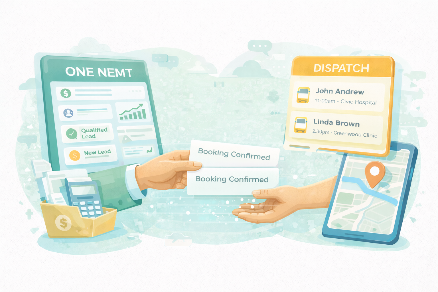 Dispatch manages drivers and routes. ONE NEMT manages demand, intake, conversion, and revenue visibility.