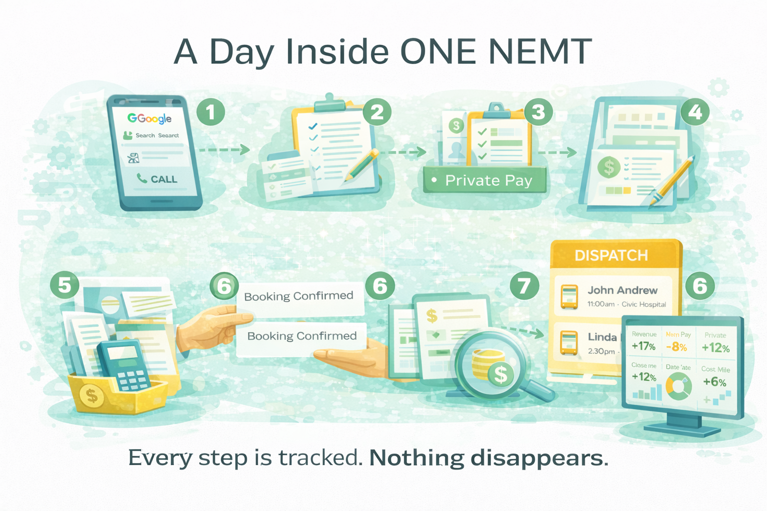 ONE NEMT centralizes your entire private pay pipeline into one structured operational layer giving you control over demand, conversion, and revenue performance.